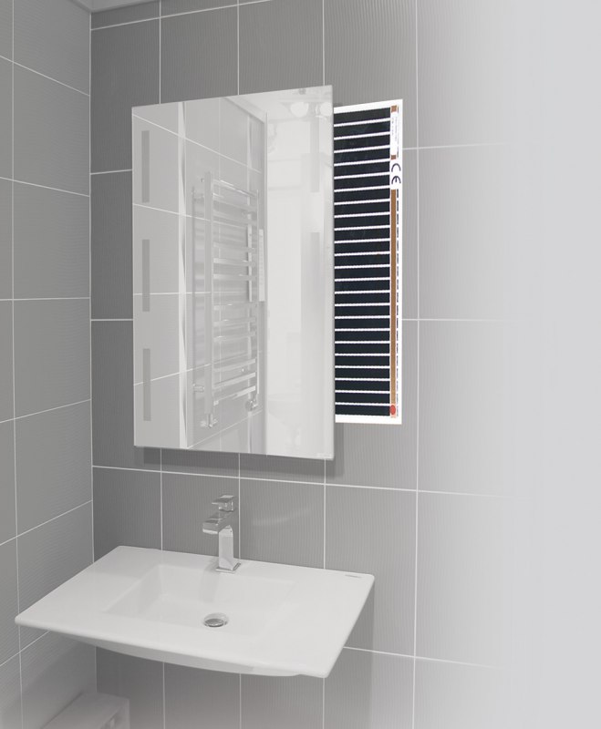 La lámina calienta el espejo impidiendo que éste se empañe. Se pone una capa fina de adhesivo en la lámina y se pega al dorso del espejo. El cable de alimentación (1m de longitud; 5×3 mm sección ovalada) dispone de una cubierta (de 6mm de grosor) en el lugar de contacto con la lámina. Es necesario dejar un lugar suelto debajo del espejo para la cubierta y la salida del conductor. El conductor de alimentación no dispone de enchufe en su extremo para que sea posible hacerlo pasar p. ej. por la pared del armario o por un tubo protector flexible en el caso de necesidad. La lámina se conecta generalmente en el alumbramiento del espejo (230 V), se permite, sin embargo, también otro tipo de conexión – un interruptor independiente, interruptor de tiempo, sensor de movimiento, etc. Aproximadamente 1 – 2 minutos después de encender la lámina desaparece de la superficie del espejo el vaho en el lugar correspondiente al tamaño de la lámina y va aumentándose hata unos 10 cm fuera de los límites de la lámina. En el caso de los espejos pegados es necesario elegir el tamaño de la lámina de manera que quede suficiente sitio libre a su alrededor para poder pegar el espejo (es imposible pegar el adhesivo a la lámina). Recomendamos instalar un marco de fijación a espejos más grandes o pesados.